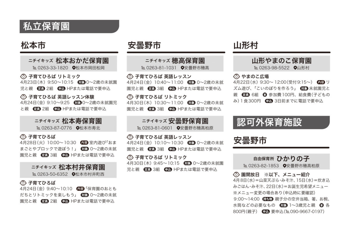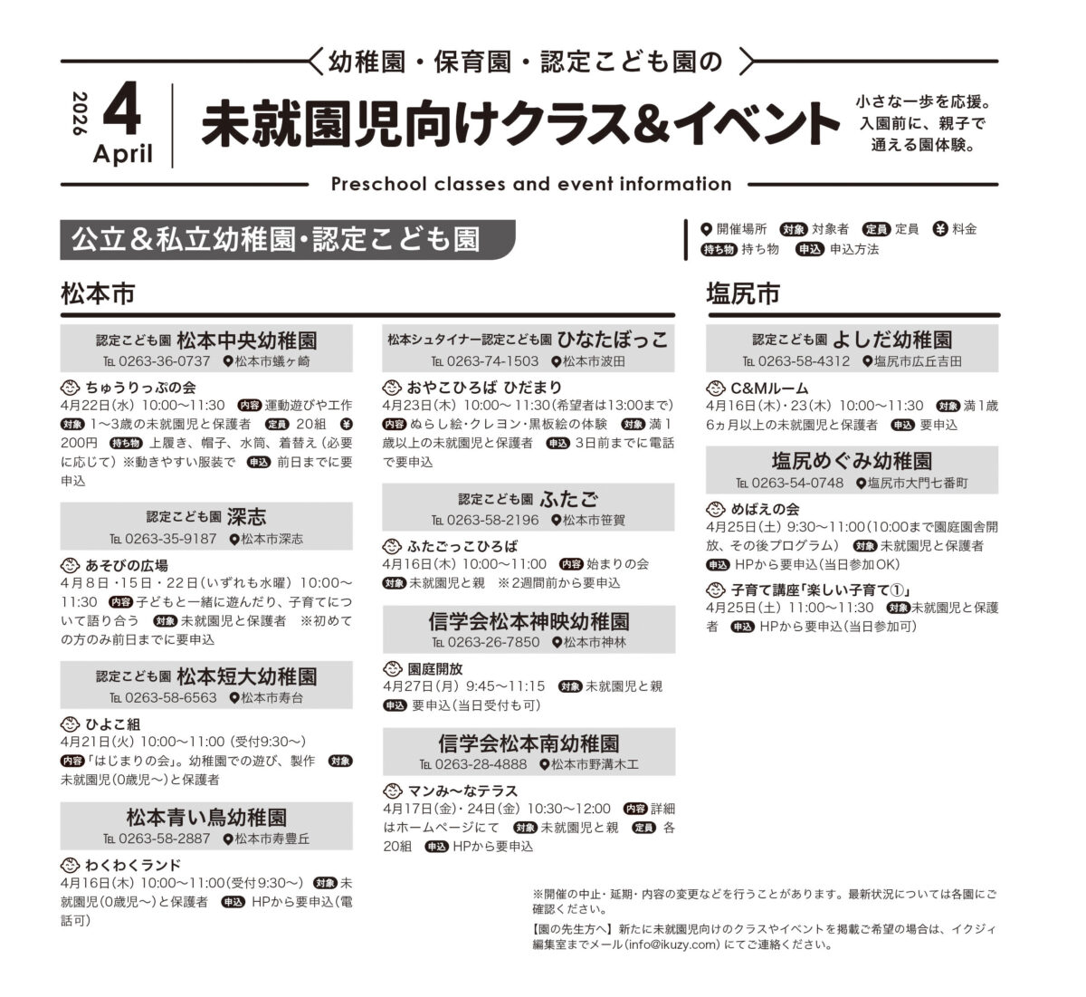 幼稚園・保育園・認定こども園などで開催される、入園前のお子さん向けの園行事、未就園児クラス、プレ保育や親子イベントなどの情報を毎月ご紹介します!