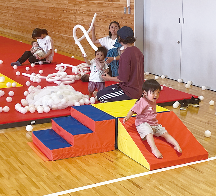 「うんどうのじかん」は、ANCアリーナ2階「柔剣道場」で開催。 歩き始めの子どもたちの「やりたい!」をかなえる、安心設計のすべり台も
