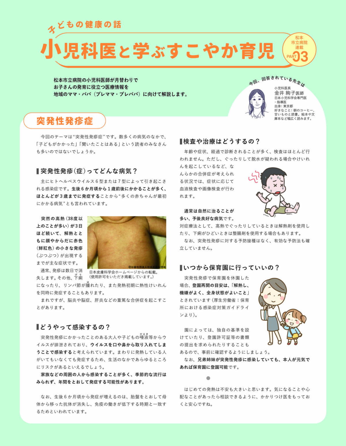 松本市立病院の小児科医師が、月替わりでお子さんの発育に役立つ医療情報を地域のママ・パパ(プレママ・プレパパ)に向けて解説します。第3回目は「突発性発疹症」について。【2025年9月号掲載】