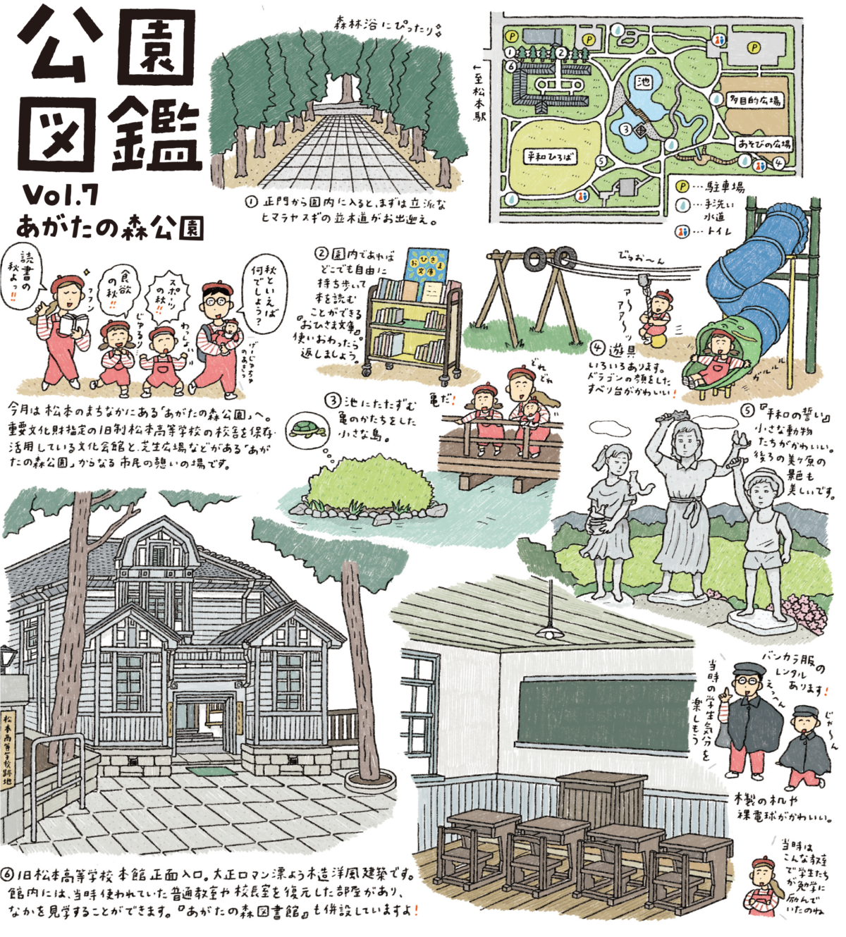 大きなヒマラヤスギ並木や日本庭園と池、広々とした芝生広場が美しい街中の公園。公園のシンボル「あがたの森文化会館」は、重要文化財旧松本高等学校の校舎を保存して、市民の教育文化活動に活用している施設。思い切り体を動かせる遊具ゾーン「あそびの広場」もあり。春には桜の名所にもなる。