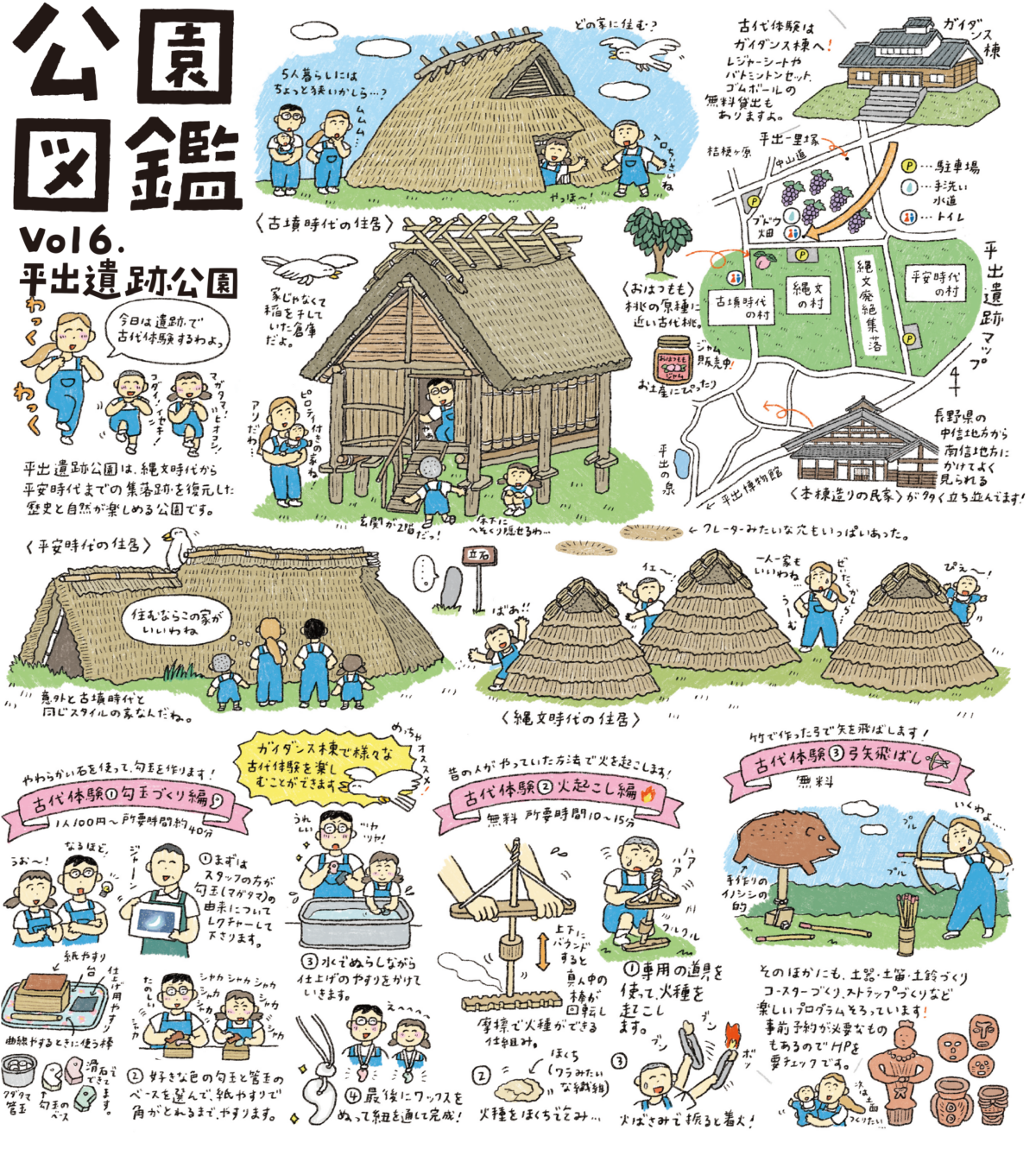 日本3大遺跡に数えられる「平出遺跡」。ぶどう畑の横に広がる遺跡公園では、縄文・古墳・平安の3つの時代の住居などが再現され、古代を体感できる場所。園内のガイダンス棟では、休憩コーナーや展望室があり、さまざまな古代体験(一部有料)ができるスポット。車で1分のところには、平出博物館がある。