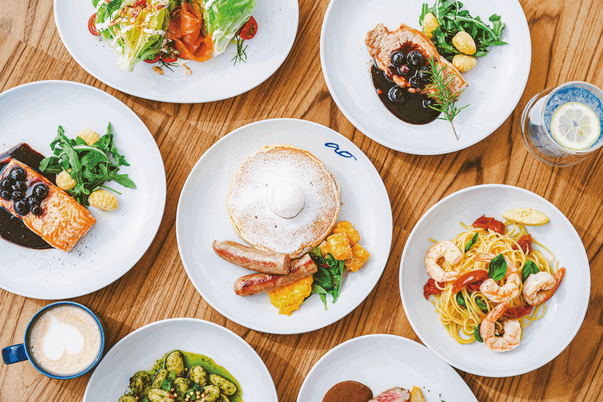 モーニング、ランチ、カフェ、ディナー、テイクアウト…と、いろんな使い方ができるカフェレストランは、カジュアルながらも、子どもと一緒に非日常感を楽しめる貴重なスポット。涼やかな景色とおいしい感動を求めて、家族みんなで訪れてみて。