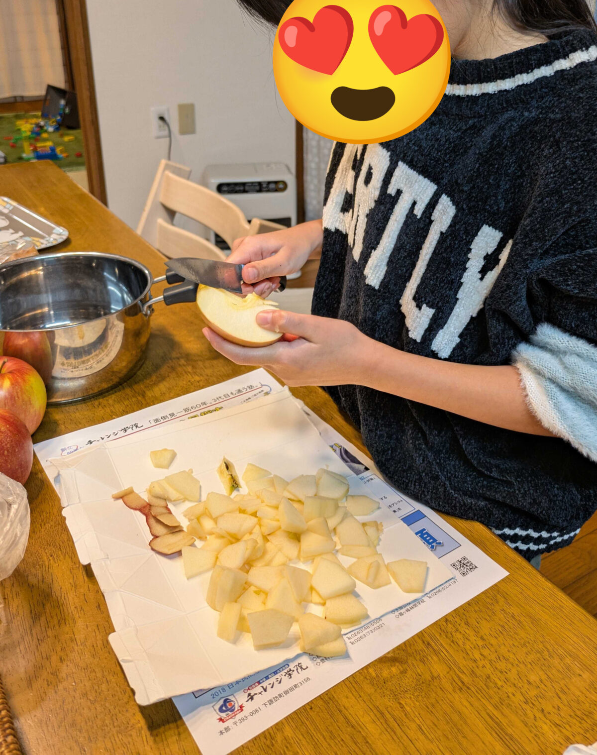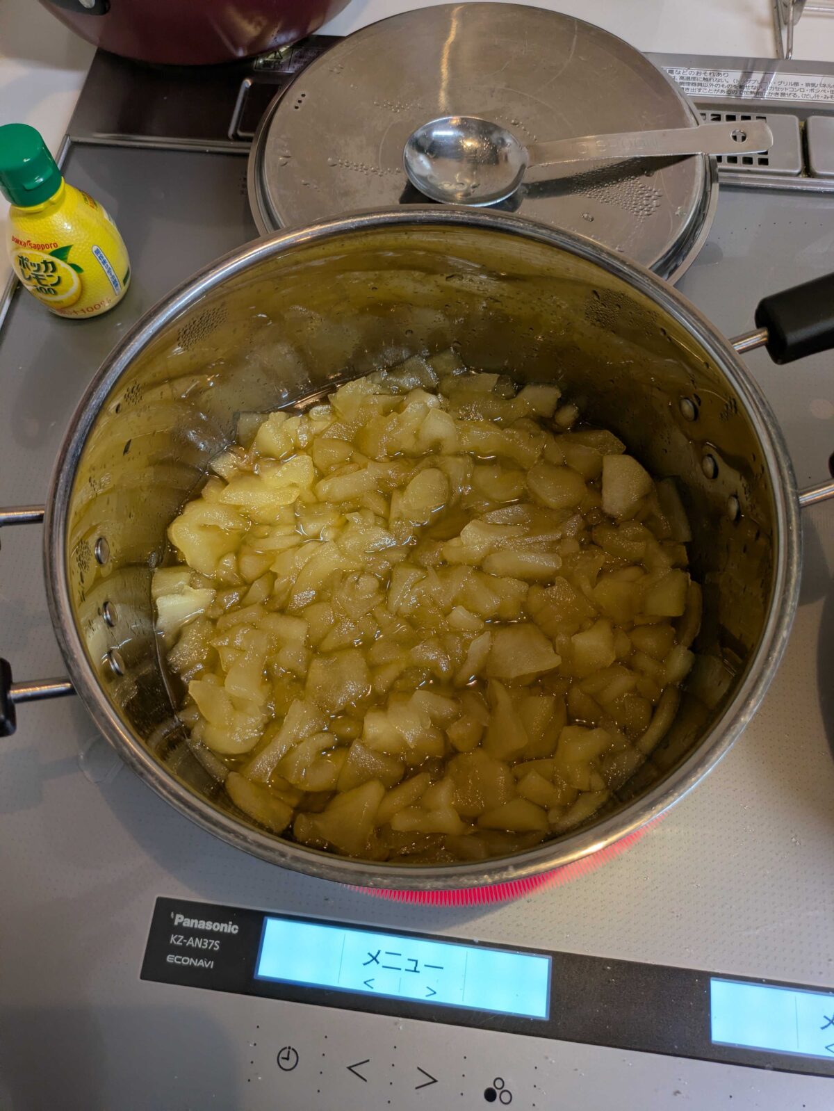 写真は大きいりんご3個分で作ったので、25分くらい煮詰めました。りんご切るの大変と言ったら、娘が頑張ってくれました(笑)。