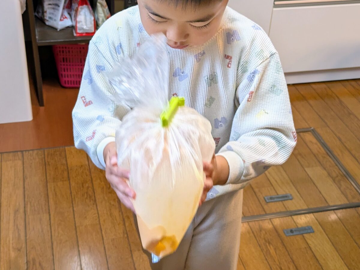 ポリ袋に卵、牛乳、砂糖を入れて、口を閉じてシャカシャカ〜とよく混ぜる。クリップで留めて、お子さんに頑張ってもらいましょう♪